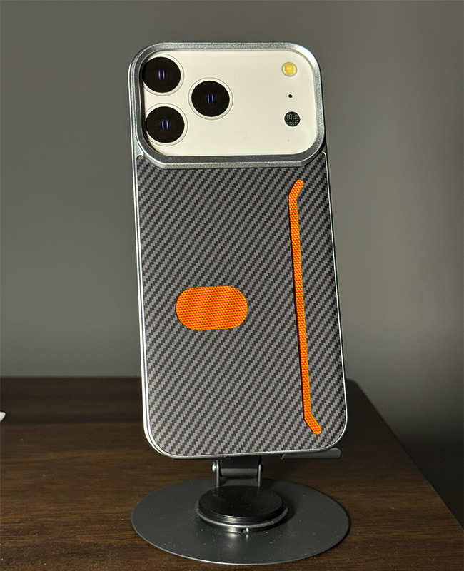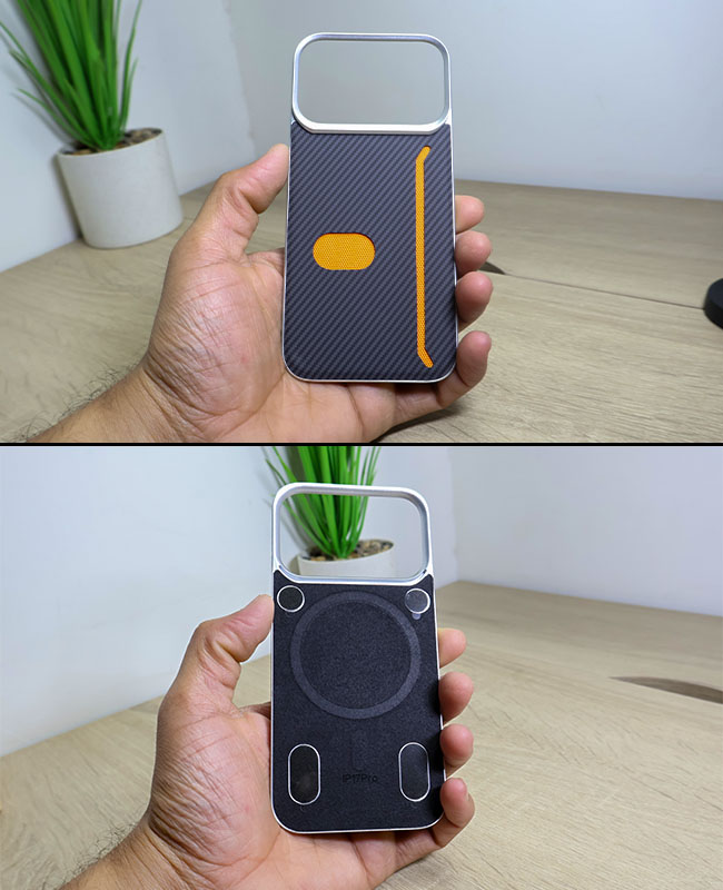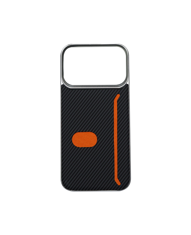 This magnetic back panel delivers a high-end carbon fiber weave texture in dark grey with vibrant orange highlights along the edges and a pop-out button for added style and function. A sleek aluminium frame encases the camera module to elevate your phone’s profile and shield the lenses from surface contact. The built-in MagSafe-compatible ring ensures seamless wireless charging and secure snaps with car mounts or wallets, all without bulk.